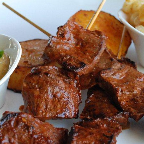 Brochetas de Corazón de ternera, adobado con especias peruanas, acompañado con patatas y crema de rocoto.