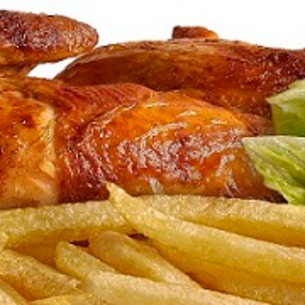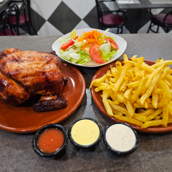 Pollo entero asado a la brasa, papas fritas, ensalada y cremas.